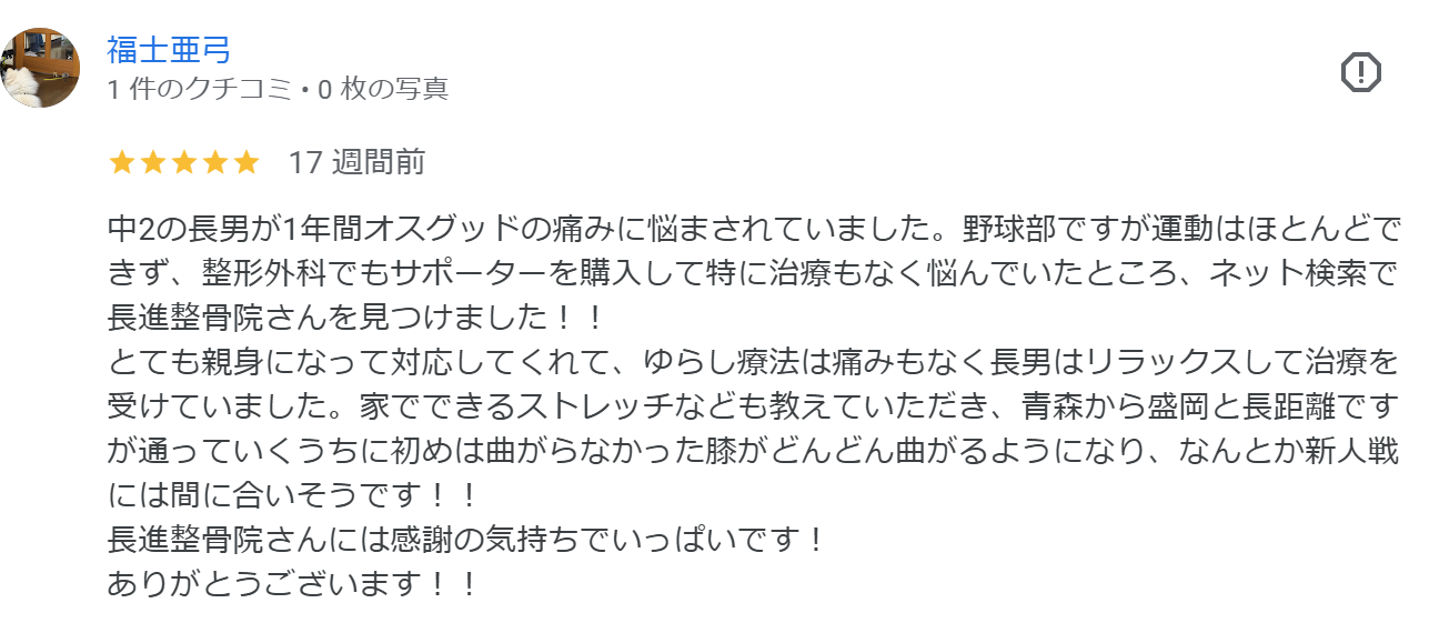 令和6年5月 運動会の練習で両膝に痛みを感じ整形外科を受診し、オスグットの診断を受ける。運動会と野球部の練習を休むことなく続けたところ、膝の屈伸やジャンプ、ランニングで痛みが憎悪。休みを挟みながら野球の大会、練習に参加していた。11月に野球部の練習でおんぶして階段の昇降を繰り返す練習をしたところ悪化。近隣の接骨院を受診。やはりオスグットの判断で現在(令和7年3月)まで週3回の施術を継続するが良化せず。なんとか痛みなく野球ができるよう施術法がネットで探し、当院のゆらし療法を知っていただき来院される。